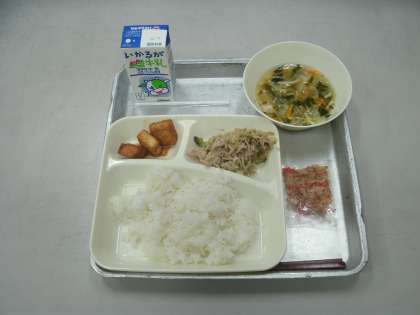 今日の給食は、ゴーヤチャンプルー、すまし汁、あつあげのみそだれかけ、ごはん、牛乳です。