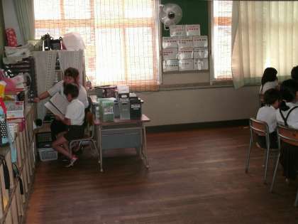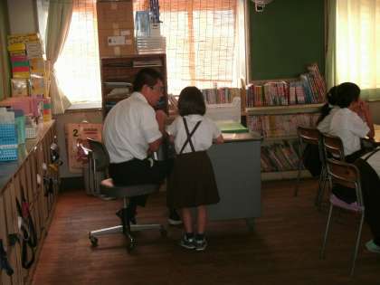 3年生は、担任の先生から、ひとりづつ通知表を受け取っていました。順番を待っている間、ビデオ鑑賞をしていました。
