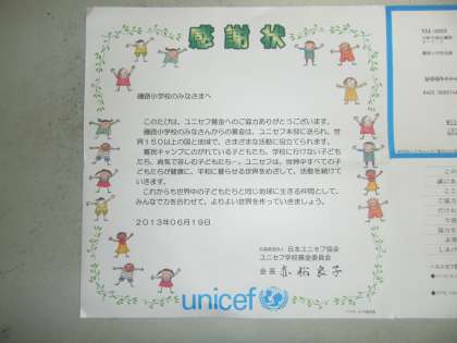 ユニセフから感謝状が届きました
