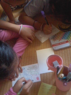 入浴の待ち時間を利用してはがきを書いたり、キャンプファイヤーの打ち合わせをしたりして過ごしています。