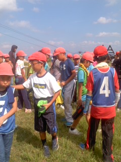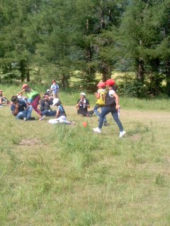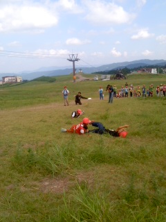 3時から高原オリンピックを行っています。草原転がり、草原フラッグ、しっぽとりを行います。1組対2組の対抗戦です。各班から種目ごとに出場メンバーを決めます。さあどちらがかつでしょうか。