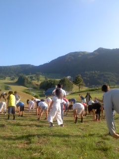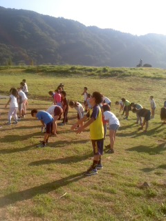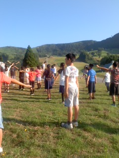 朝日を浴びてラジオ体操をしています。ラジオ体操の号令は昨日はドラえもん、今日は大阪弁バージョンでした。