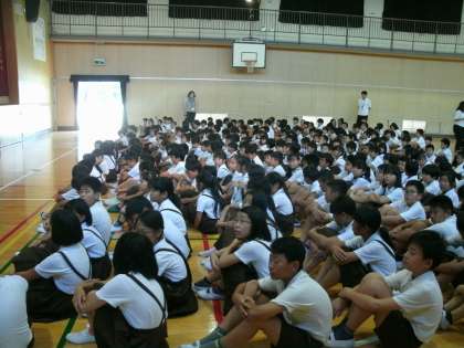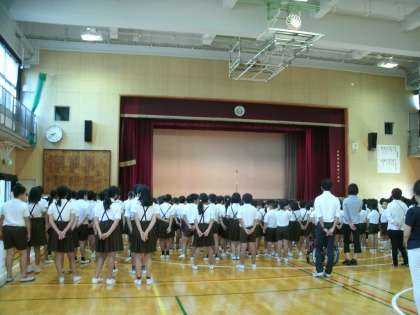 久しぶりに全校児童が集まりました。大阪市歌の斉唱で始まった始業式は、生活指導部からの話を聴いた後、校歌斉唱で終わります。