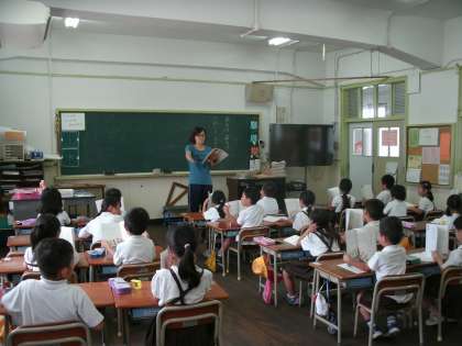 1年1組は、国語の学習をしていました。「あるけ あるけ」の音読をしていました。