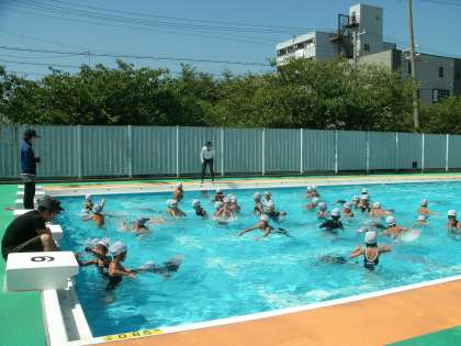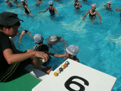 1年生は、プール水泳をしていました。宝さがしをしているところです。