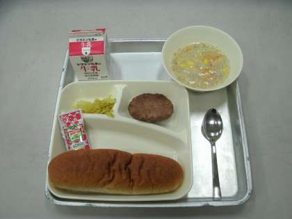 今日の給食は、焼きハンバーグ、豆乳コーンスープ、キャベツのカレーソテー、ライ麦パン、牛乳です。