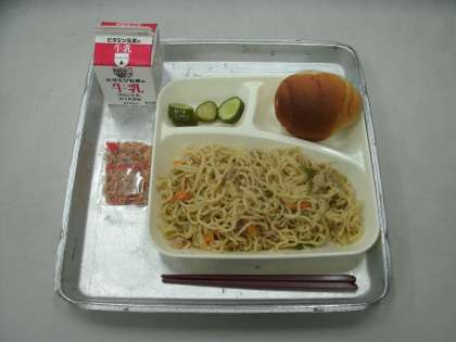 今日の給食は、和風焼きそば、きゅうりのゆず風味、黒糖クレセントロール、牛乳です。