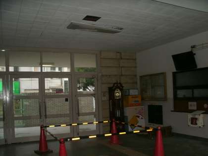 玄関の天井のボードが一部抜け落ち、照明が傾いています。