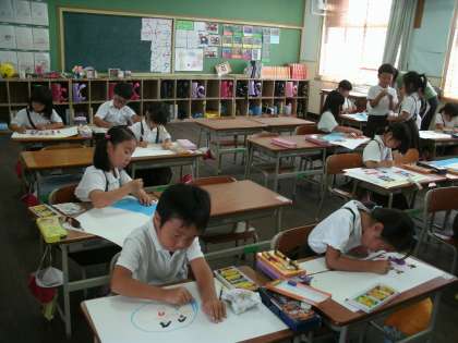 1年1組は、図画工作の学習をしていました。「夏休みの思い出」を絵に描き表していました。