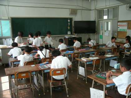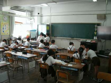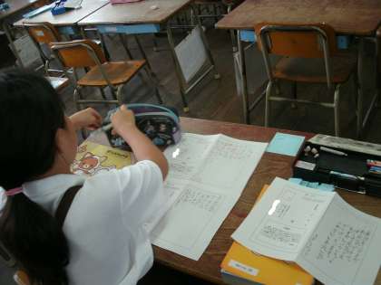 2年1組は、敬老の日に送るハガキを書いていました。練習用の用紙に書いたおたよりを、担任の先生に確認してもらいます。誤字・脱字がないように一文字一文字ていねいに心を込めて書いていました。