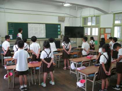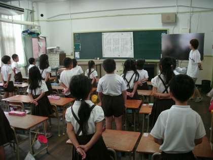 1年2組は、音楽の学習をしていました。発声練習の後、磯路小学校の校歌を元気よく歌っていました。