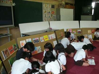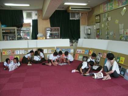 5年2組は、多目的室の「えほん広場」にいました。それぞれのスタイルで絵本を楽しんでいました。