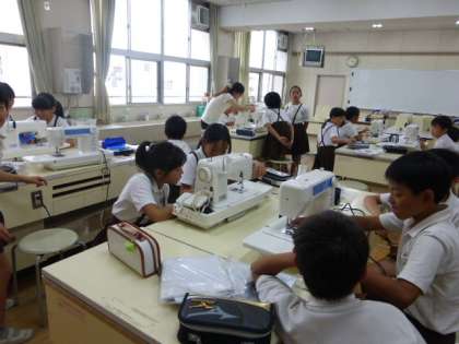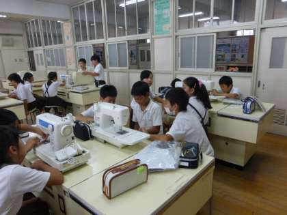 5年生は、家庭科室でミシンを使って、ナップザック作りをしていました。