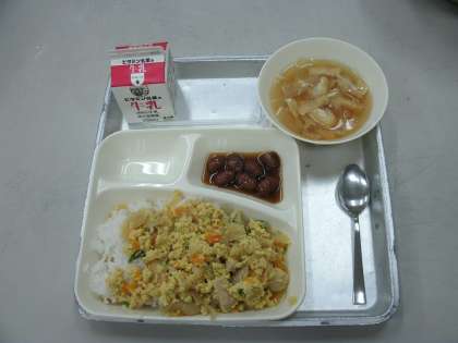 今日の給食は、親子丼、とうがんのすまし汁、金時豆の煮もの、牛乳です。