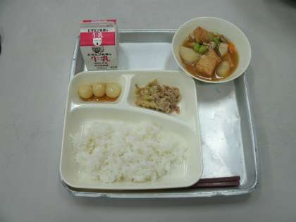 今日の給食は、鶏肉とさといもの煮物、豚肉とキャベツの炒め物、みたらしだんご、ごはん、牛乳です。
