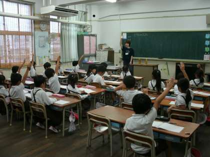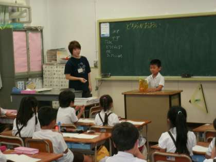 1年2組は、算数の学習をしていました。形状の異なるペットボトルに入った2本のお茶をならべて「どちらがおおい」か考えていました。