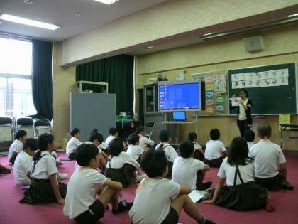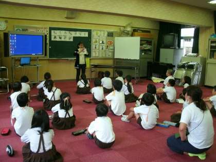 3年2組は、多目的室で外国語活動をしていました。果物などの名前をカードを見ながら英語で答えていました。