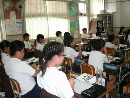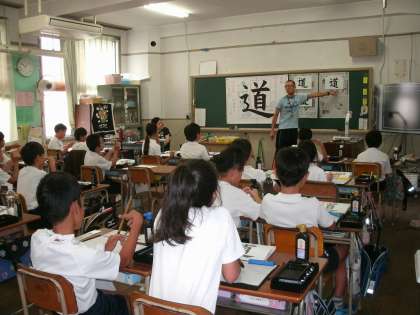 5年1組は、国語の学習をしていました。毛筆で「道」の練習をしていました。残念な「しんにょう」の3パターンを書き示した字を見ながら説明を聞きました。それから全体のバランスを考えて書き始めました。