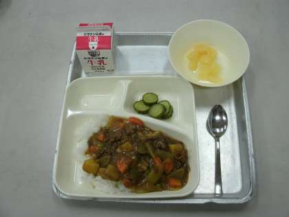 今日の給食は、ビーフカレーライス(米粉)、きゅうりのピクルス、白桃(カット缶)、牛乳です。