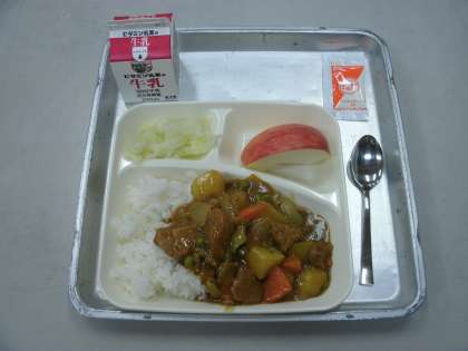 今日の給食は、ポークカレーライス(米粉)、キャベツのサラダ(ノンエッグドレッシング)、りんご、牛乳です。