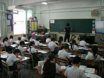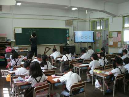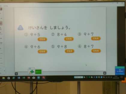 1ね年1組は、算数の学習をしていました。くり上がりのあるたし算の練習問題を解いていました。