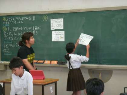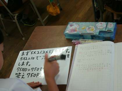 「1個75円のお菓子が、ひと箱に5個ずつ入っています。2箱買うと代金はいくらになりますか。』という問題の計算の仕方を考えていました。