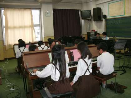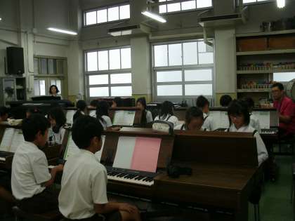 5年2組は、音楽室でアンサンブルオルガンを演奏していました。