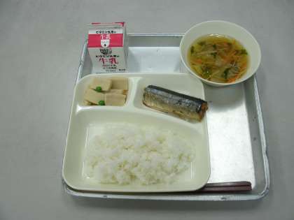 今日の給食は、さんまのさんしょう焼き、すまし汁、高野どうふの煮物、ごはん、牛乳です。