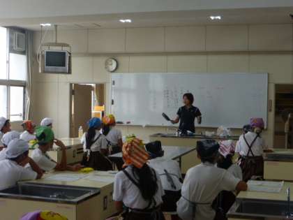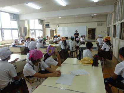 6年生は、家庭科室で調理実習をしました。野菜炒めと卵料理を作りました。包丁を使うので、始めに安全面についての注意を聞きました。