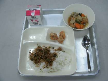 今日の給食は、鶏肉のたつたあげ、厚揚げと野菜の煮物、おかか菜っ葉、ごはん、牛乳です。