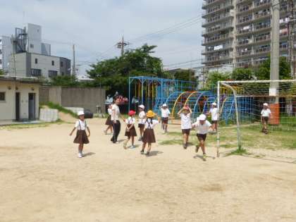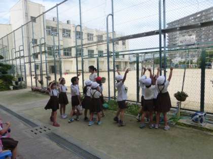 2年生は、運動場でお楽しみ会をしていました。暑いのでミストで涼んでいました。