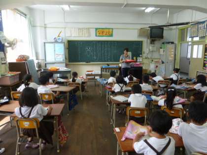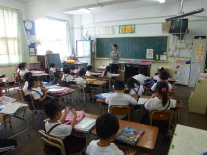1年生の教室での様子です。夏休み中のくらしについての注意を聞き、プリントを配ってもらっていました。