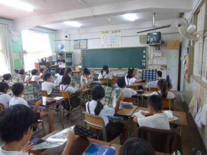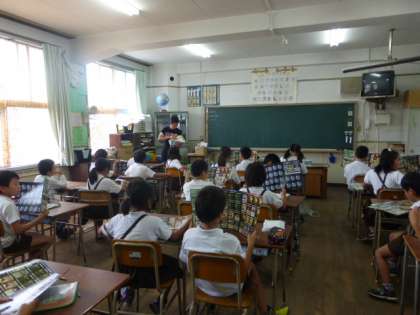 4年生の教室での様子です。印刷物を配ってもらっているところです。