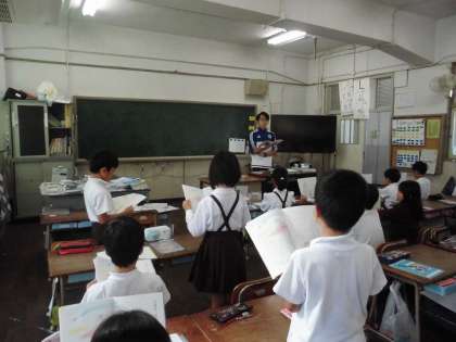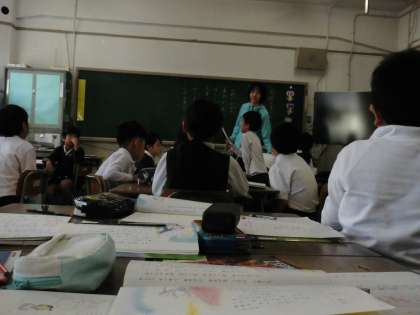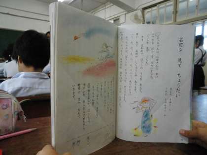 2年は国語で「名前を見てちょうだい」という物語分を学習しています。はじめに読み取ったおおまかな内容について、こどもたちが発表し、それに対して質問したり付け加えたりして授業を進めていました。