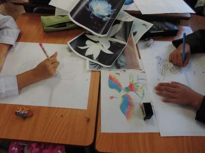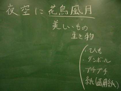 図工「夜空に花鳥風月」という単元で、美しいものや生き物を表現する学習をしています。絵具だけではなく、ひもや段ボールなどいろいろなものを使って表現します。どんな美しいものができあがるのか楽しみです。