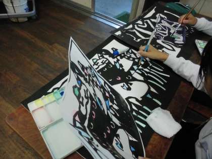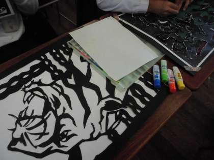 切り絵も完成に近づいてきました。出来栄えをよくするため少し着色する段階に入っています。すばらしい作品ができつつあります。