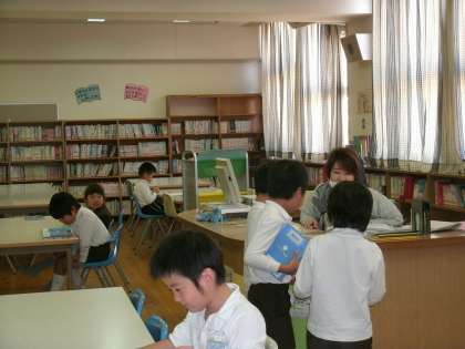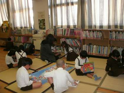 1年2組は、図書室で読書をしていました。学校図書館補助員さんに絵本を読んでもらっている児童もいました。