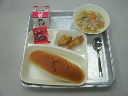 今日の給食は、白身魚のフリッター、スープ煮、コッペパン、牛乳です。