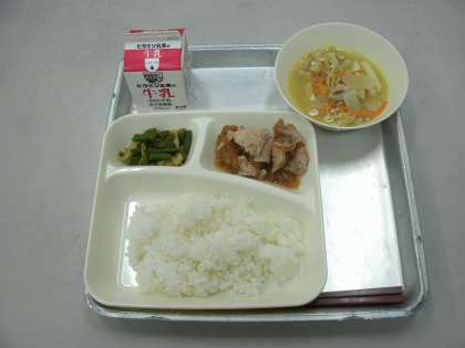 今日の給食は、豚肉のしょうがじょうゆかけ、けんちん汁、三度豆のからしじょうゆあえ、ごはん、牛乳です。