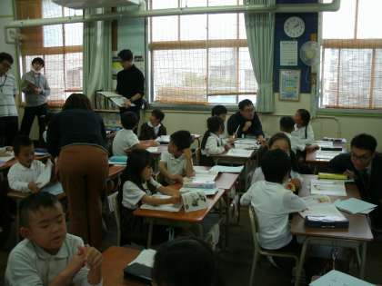 子どもたちは、始めのうちはたくさんの参観者が気になる様子でしたが、授業が進むにつれて集中して学習できていました。