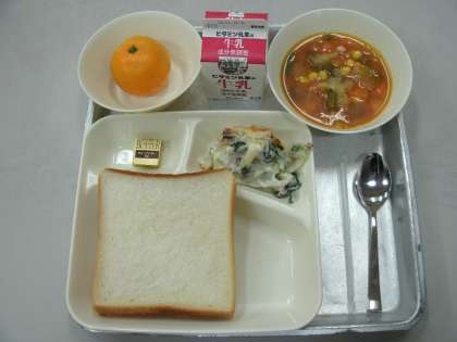 今日の給食は、鶏肉と野菜のケチャップ煮、ほうれん草のグラタン、みかん、食パン、牛乳です。