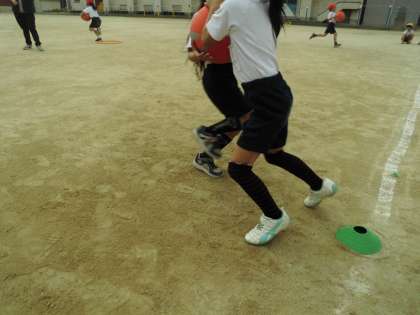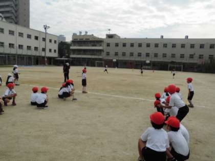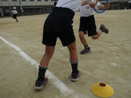 1年生は体育で初めてリレーをしました。1回目はバトンのかわりに輪を使い、2回目はボールを使いました。みんな一生懸命に走っていました。先生からは、相手にやさしく渡してあげるようにと教えてもらいました。