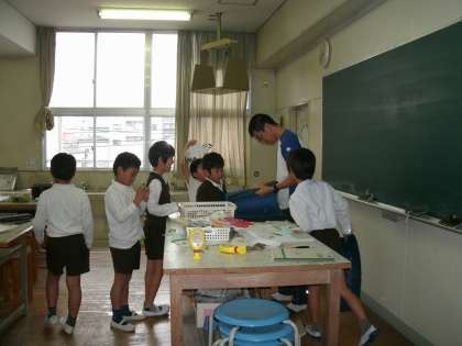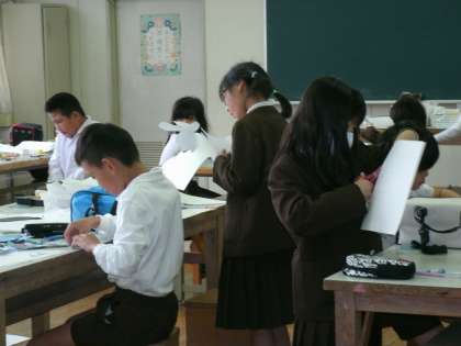 3年1組は、図工室で紙版画の作品作りに取り組んでいました。