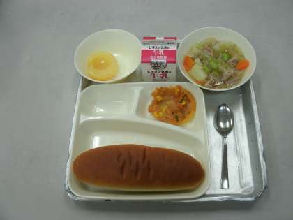 今日の給食は、豚肉と野菜のスープ煮、変わりピザ、白桃(缶)、黒糖パン、牛乳です。