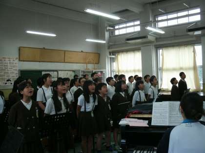 修学旅行の時、平和記念公園で歌った「HEIWAの鐘」を合唱していました。