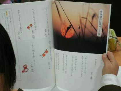 「日本語のしらべ—秋」で三木露風の「赤とんぼ」を音読していました。