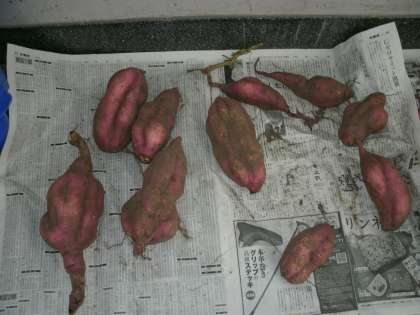 2年生の教室前の廊下には、昨日学習園で掘ったさつまいもが並んでいます。