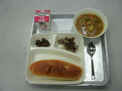 今日の給食は、牛肉の香味焼き、豚肉とだいこんのカレー煮、うずら豆のグラッセ、おさつパン、牛乳です。