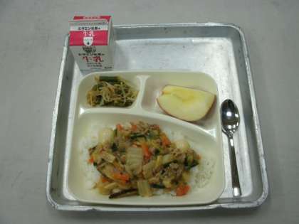 今日の給食は、中華丼、もやしの中華あえ、りんご、牛乳です。