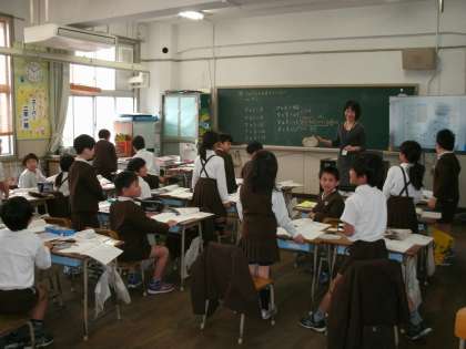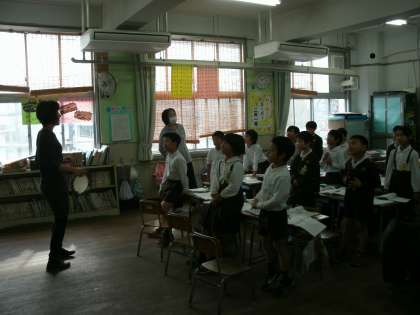 「7のだんの九九をくふうしてつくろう」の学習の後半では、担任の先生が打つタンバリンのリズムに遅れないように7の段を暗唱していました。